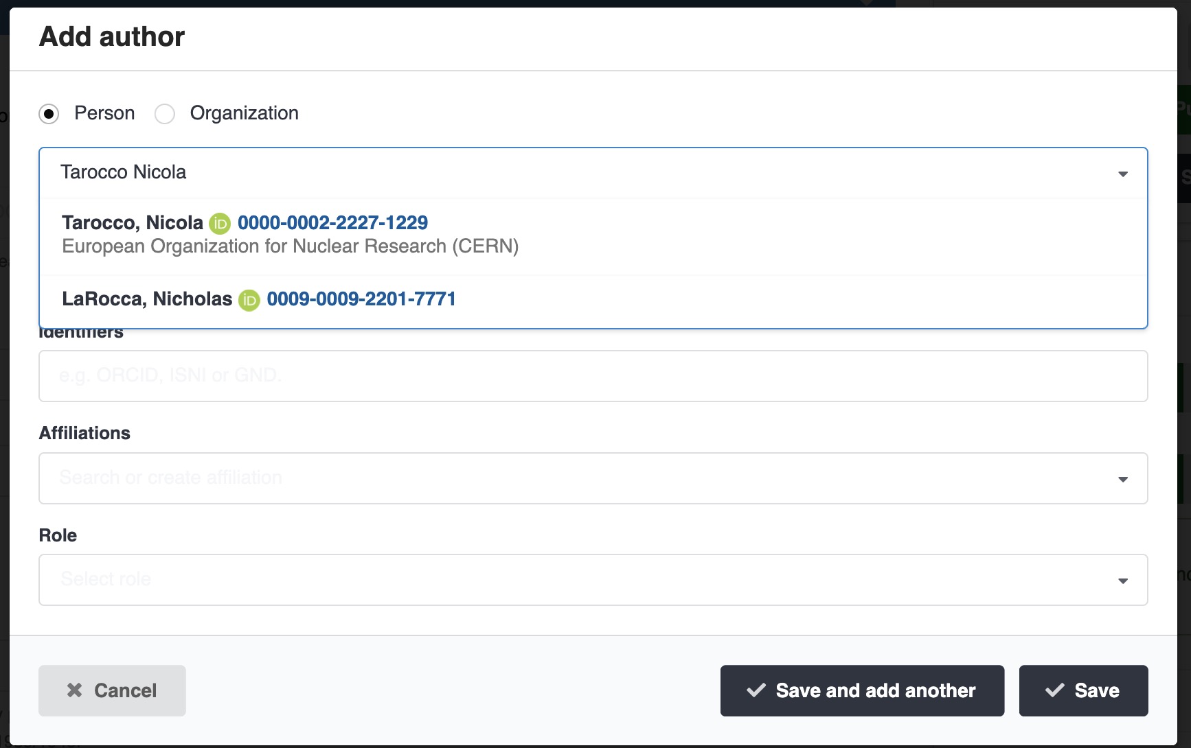 - Author/Creators: Add all authors or creators. Use the autocomplete field to search names; CDS synchronises with the ORCID and CERN user databases.