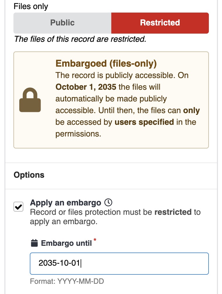 You can apply an embargo to one or more files by selecting Apply an embargo and configuring the embargo policy: