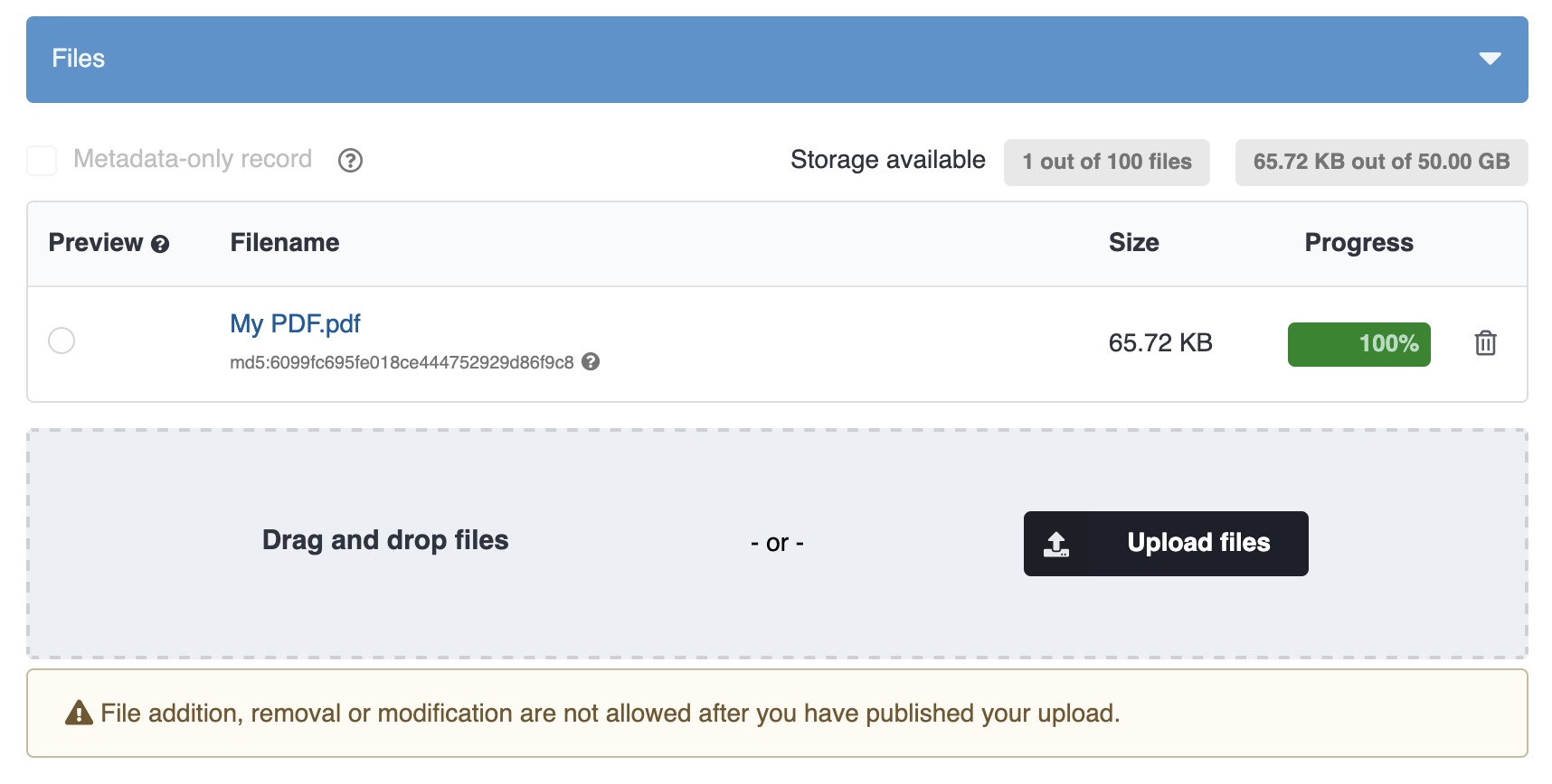 Click the Upload files button, or drag-and-drop one or more files onto the drop zone to start uploading. By default you can upload up to 100 files with a combined maximum size of 50 GB. If you need more, please contact us.
